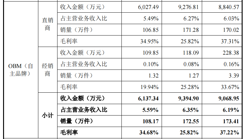 2020年-2022年,香江电器自主品牌的收入分别为9068.95万元、9394.9万元和6137.34万元,占主营收入的比例仅为6.19%、6.35%和5.59%。