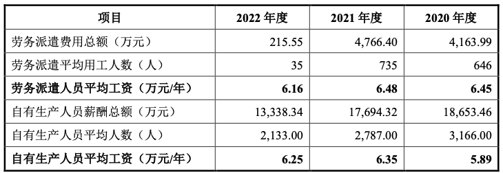 不过,即使是劳务派遣工,香江电器也并未“厚此薄彼”。《回复问询函》显示,2020年、2021年劳务派遣人员的年均工资为6.45万元、6.48万元,略高于自有生产人员的5.89万元、6.35万元。
