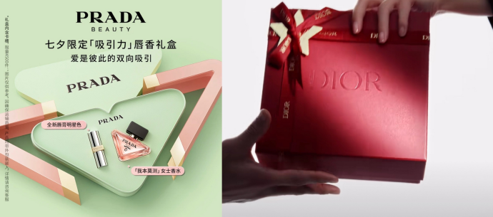 作为时装、包袋领域的大牌,两个品牌在七夕的主推品类选择上更聚焦“送礼”场景,同时将主品类的经典款再推一波。前者刚刚推出了美妆线,它也顺理成章成为品牌七夕营销的第一大品类,降低了“年轻人的第一件Prada”的入手门槛。后者则主推“香水+口红”的品类组合,都是兴趣属性高于实用属性的典型品类,更适合送礼,也更适合七夕。