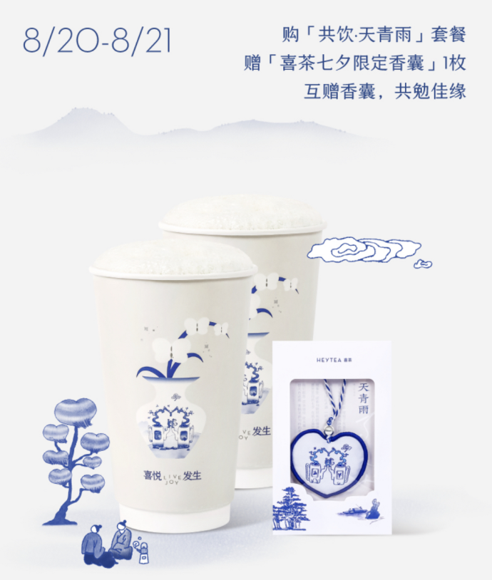 在联名上,喜茶一贯“只做第一,不做第二”,这次又是领先全行业和方文山联名,推出“天青色”为主题的新包装,推广更适合秋冬季节的乳茶产品,同时用冷色调做出了差异化,在被红粉的喜庆氛围笼罩的七夕节点,显得格外清新。