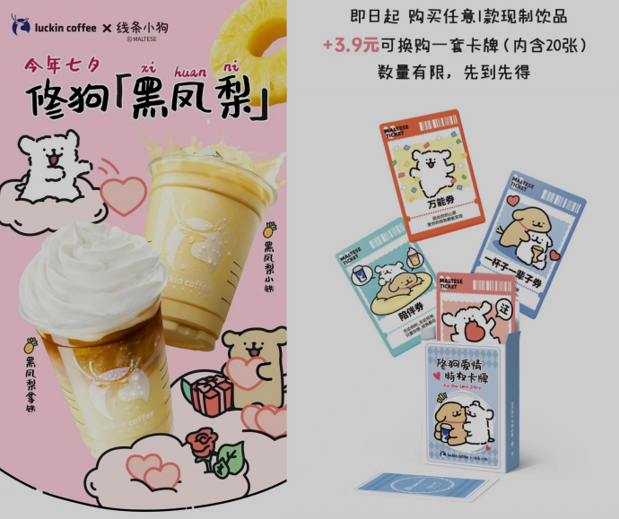 作为现制饮料赛道IP联名的“大户”,继去年的悲伤蛙联名大爆之后,瑞幸今年进一步加码七夕节点,推出线条小狗联名产品,用更可爱、有亲和力的形象打爆传播。在贴纸、杯套等周边产品上的用心投入,也为瑞幸带动了一大波饮料销量。