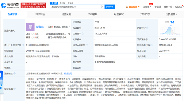 天眼查App显示,近日,上海加减乘除餐饮管理有限公司成立,注册资本1400万人民币,经营范围含餐饮管理、食品添加剂销售、酒类经营等,顾海燕为法定代表人,林吉荣(张庭老公)为董事。股权全景穿透图显示,该公司由上海庭林企业管理有限公司和上海云合云想咨询策划有限公司共同持股,前者由上海庭然科技发展有限公司和上海达尔威实业有限公司共同持股,庭然科技为张淑琴(张庭)关联公司,达尔威实业为张庭夫妇关联公司。(天眼查)