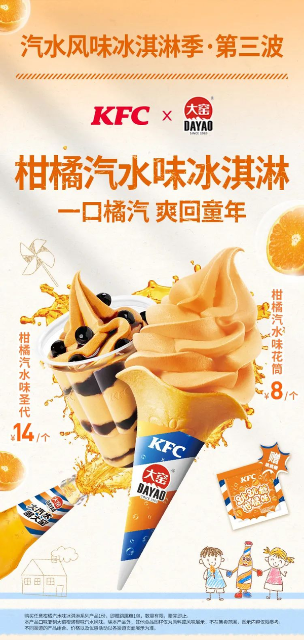 8月21日,大窑官宣与肯德基联名推出柑橘汽水味冰淇淋,新品复刻大窑橙诺汽水风味,搭配柑橘味跳跳糖,为用户带来满满的夏日劲爽感。目前,肯德基全国门店已同步上市联名冰淇淋。(品牌官方)
