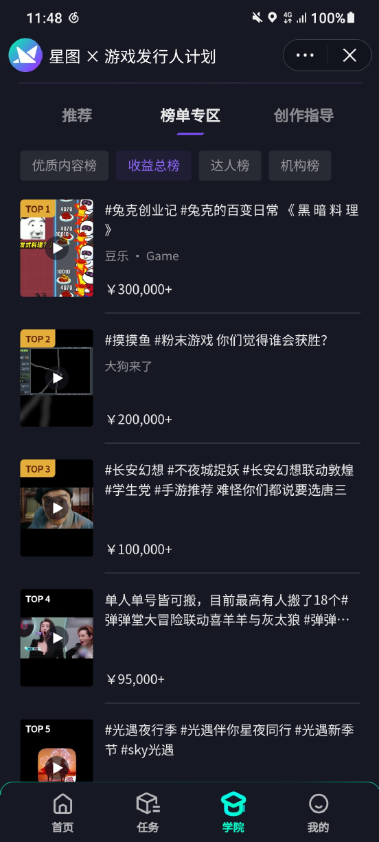 个人则可以参与“发行人计划”,利用游戏自带的“分享给好友”和“录屏分享”功能进行推广,同时获得收益;各种大V和网红通过自己的短视频为游戏进行点对点的推广,以CPS、CPC的形式进行分成;抖音还定期开展针对达人的游戏推广活动,推出直播推广任务等……一个爆款视频能够为作者带来近六位数的收益,属实是一年不开张,开张吃一年。