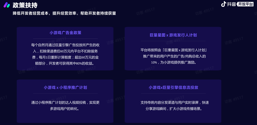 总的来说,抖音的平台让利、原创保护、资源扶持等政策,一定程度上是为了聚拢优质的开发者,并降低游戏团队的运营成本。当前抖音小游戏正处于野蛮生长的时期,大厂纷纷入局,精品频出。其旺盛的生命力,使它成为游戏行业中不可忽视的一股力量。