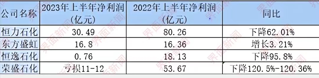 荣盛石化更是由盈转亏,上半年预计亏损11亿-12亿元,同比下降120.5%-122.36%。