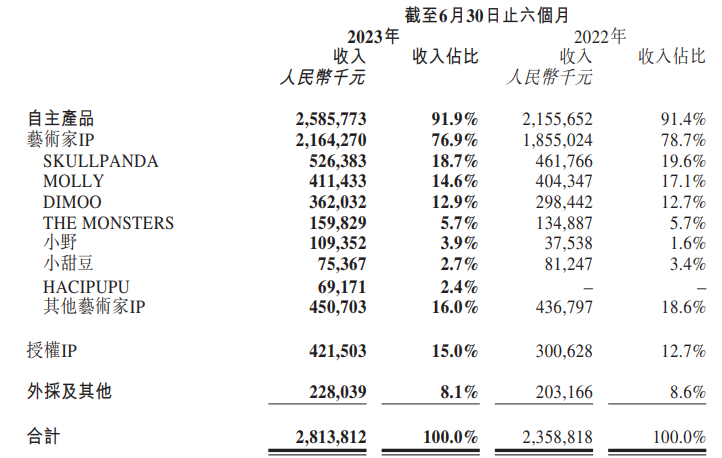 上半年,泡泡玛特将原来的自有IP和独家IP分类合并为艺术家IP,包括SKULLPANDA、MOLLY、DIMOO和 THE MONSTERS、小野、小甜豆、HACIPUPU等。