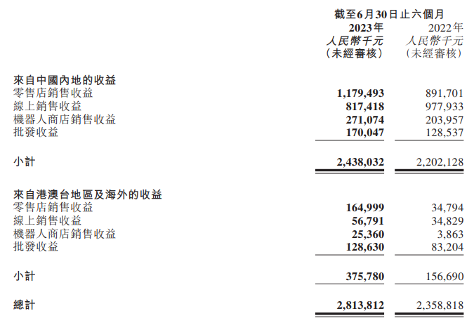 在中国内地市场,泡泡玛特收入24.38亿元,其中11.79亿来自零售店、8.17亿来自线上、2.71亿来自售货机、1.7亿来自批发。
