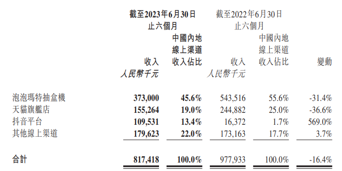 线上方面,上半年泡泡玛特抽盒机收入3.73亿,同比减少31.4%;天猫旗舰店收入1.55亿,同比减少36.6%;抖音平台收入1.1亿,同比猛增569%;其他线上渠道收入1.8亿,同比增长3.7%。