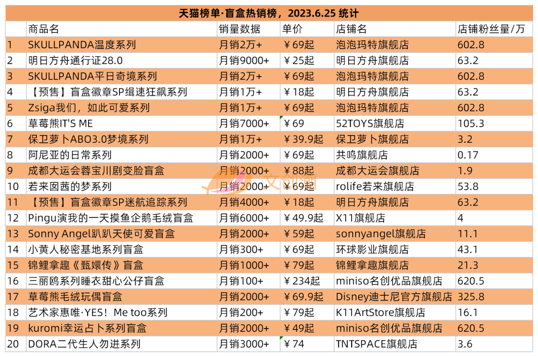 据文创潮每周发布的观察,在天猫榜单,泡泡玛特2023上半年进入盲盒销量TOP3的产品有: