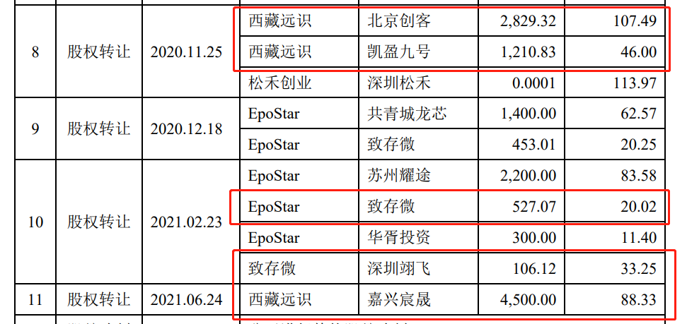 2021年2月,EpoStar向致存微以527.07万元转让20.02万股,单价约26.33元/股;同期,致存微向深圳翊飞转让33.25万股,总价106.12万元,单价仅为3.19元/股。据悉,群联电子为EpoStar第一大股东。