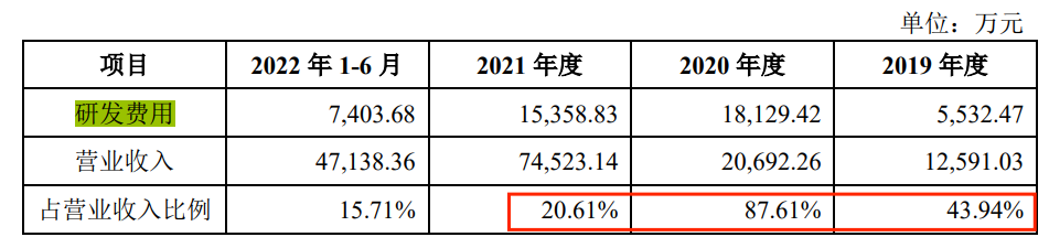 得一微回复上交所问询函的资料显示,2019-2022年6月,企业的研发费用率分别为43.94%、87.61%、20.61%、15.71%,大幅高于同行业可比公司平均水平13.19%、14.74%、11.40%、13.65%。