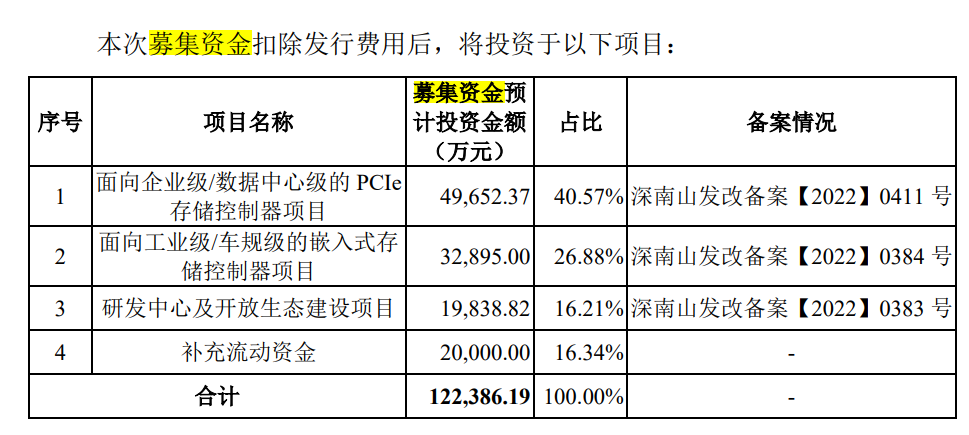 按照规划,两个存储控制器项目拟投资8.25亿元,用于对存储控制技术进行升级迭代和工艺拓展;1.98亿元用于研发中心及开放生态建设项目;2亿元用于补充流动资金。