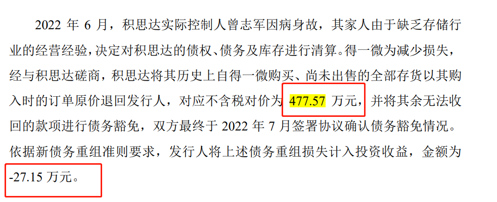 两年后,曾志军因病身故。于是,积思达将其历史上自得一微购买、尚未出售的全部存货以其购入时的订单原价退回得一微,对应不含税对价为477.57万元。除此之外,得一微将其余无法收回的款项进行债务豁免,金额为27.15万元。