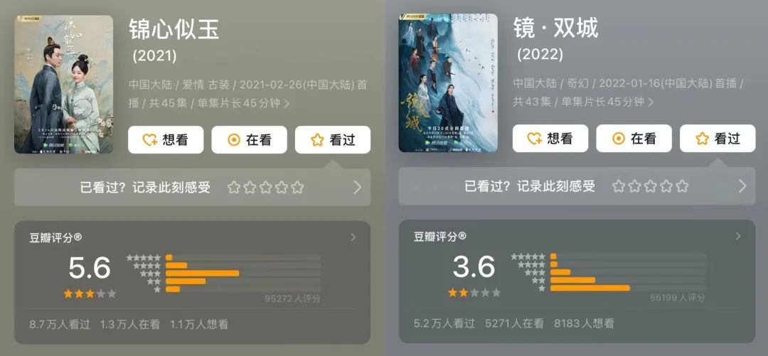 《锦心似玉》改编自2010年言情小说《庶女攻略》,剧中充斥大量无脑雌竞和嫡庶尊卑,在当下格外强调“女性互助”和“自立平等”的社会环境下变得格外扎眼,最终豆瓣评分只有5.6分;同样,古早台词和设定不适合当下影视环境的还有根据沧月同名小说改编的《镜·双城》,豆瓣评分仅有3.6分。