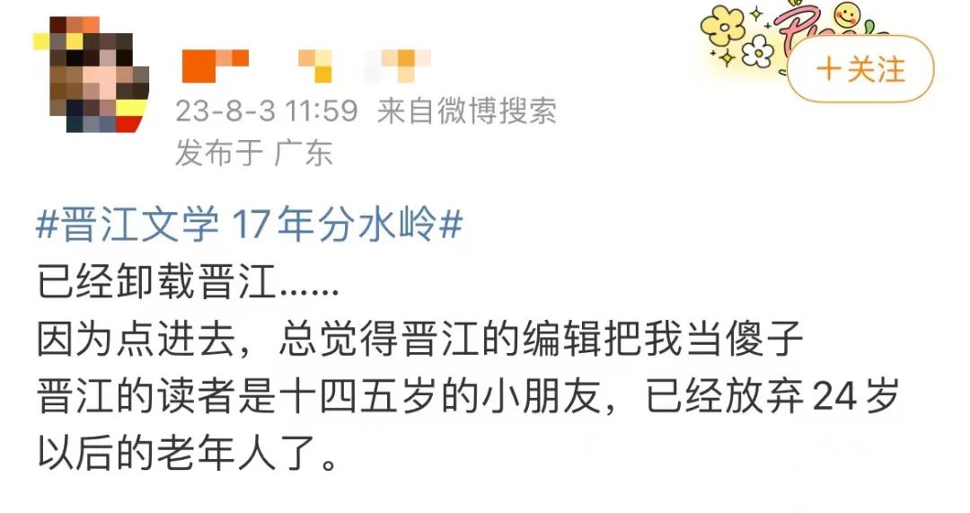 年轻用户群体的增加,不可避免地让网络文学走向低龄化。8月3日,“晋江文学 17年分水岭”冲上热搜,评论大多是对近些年言情爆款的不满。