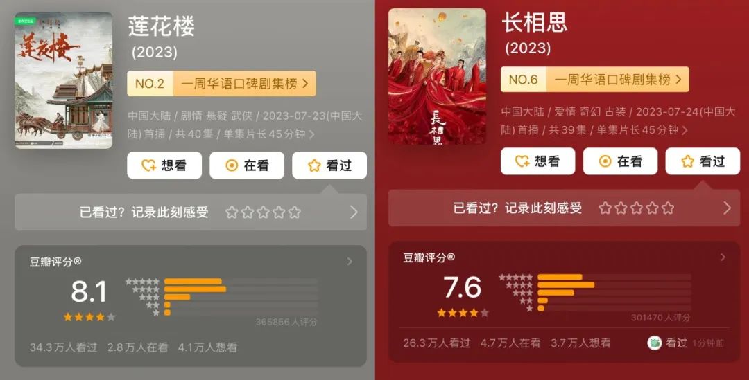 面对改动,原著作者没有表示不满,桐华甚至亲自操刀了《长相思》的改编,《长相思》豆瓣评分有7.6,《莲花楼》更是高达8.1,不错的口碑证明了观众对内容的认可。