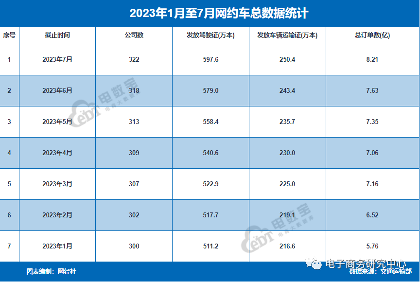 据网约车监管信息交互系统统计,截至2023年7月31日,全国共有322家网约车平台公司取得网约车平台经营许可,环比增加4家;网约车监管信息交互系统7月份共收到订单信息8.21亿单,环比上升7.6%。其中,网约车聚合平台完成2.32亿单,环比上升6.4%。