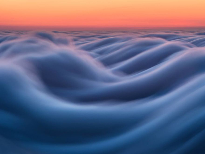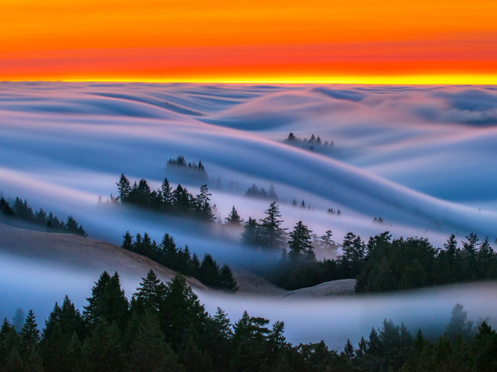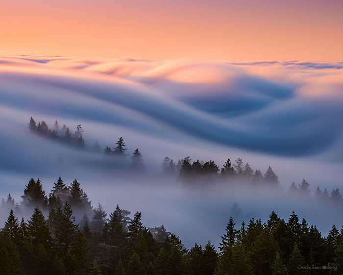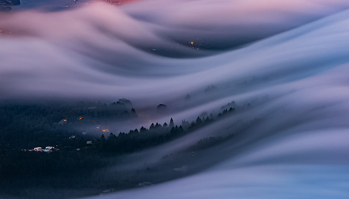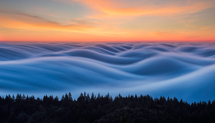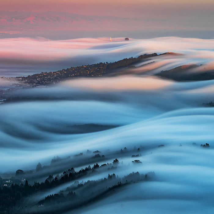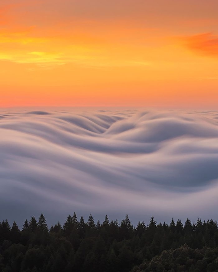最近我发现了一件很奇妙的事,夏日时因地热而产生的雾气会飘到海拔1000多米的上空,因此在海湾地区(包括金门大桥)已经无法拍到它们了。而且由于这些雾气来自太平洋,所以在海岸线一带根本无法拍摄。因此若想要拍摄它们,只能登上高处,其中一个最佳拍摄地就是塔玛佩斯山,这里的海拔有2572米。登上塔玛佩斯山山顶,你会有一种“会当凌绝顶”的感觉,又或像是在飞机上俯视云海。我来这里拍摄了数百次,而我发现当雾气穿梭在山间,并且处于恰好的高度和浓度时,会营造出一种“雾浪”的视觉效果,就像大海一样。
