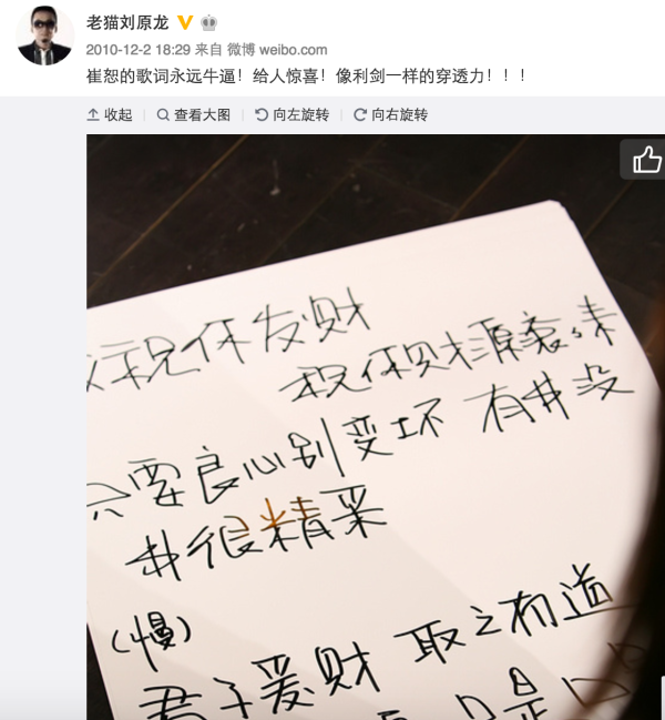 (崔恕是老猫经常合作的作词者,图为老猫转发崔恕的歌词)