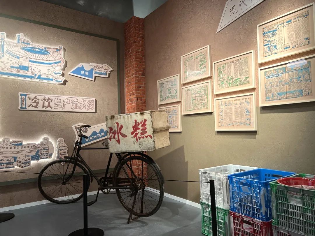 此外,现场还设了“冷饮生产流水线”实景角,载着满满一箱冰糕的脚踏车、成箱成箱的搪瓷盆、暗红色的老式砖墙,都带着市民“穿越”回了上世纪的老上海。墙上的显示屏中,展现着《科学画报》曾刊载的《现代科技图说——冷饮生产流水线》,用专业又不失趣味的方式,让孩子们了解好吃的冷饮是如何诞生的。