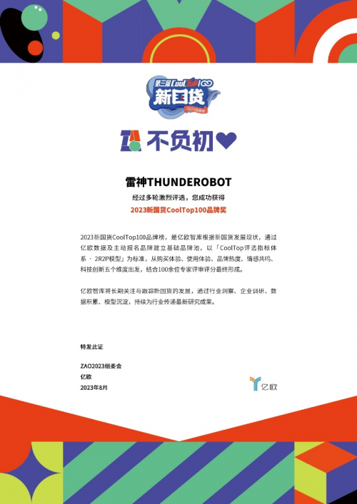 近日,以“不负初心,Stay Gold”为主题的亿欧ZAO新消费大会在北京举行。会上,亿欧发布了“2023新国货CoolTop100品牌榜”,雷神成功入选,成为榜单里唯一的全场景电竞装备品牌。