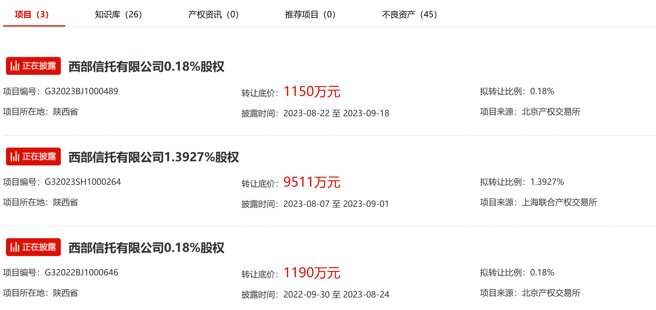 于西部信托而言,这已经是本月第二家挂牌拟“出清”公司股权的股东。而在全国产权行业信息化综合服务平台上,正在挂牌转让西部信托股权的国资股东已增至三家,除中国航发西航外,还有中铁宝桥集团有限公司(下称:中铁宝桥)、宝鸡石油钢管有限责任公司(下称:宝鸡钢管)。