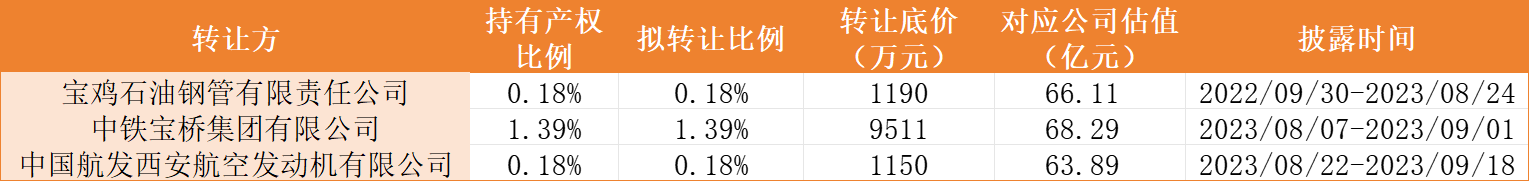 就转让原因看,此次中国航发西航和中铁宝桥并未披露转让原因;宝鸡钢管则在转让明细中披露,挂牌转让依据为股东中国石油天然气集团有限公司于2022年1月批准的《关于清理退出所持金融机构股权的通知(财务函〔2022〕7号)》。