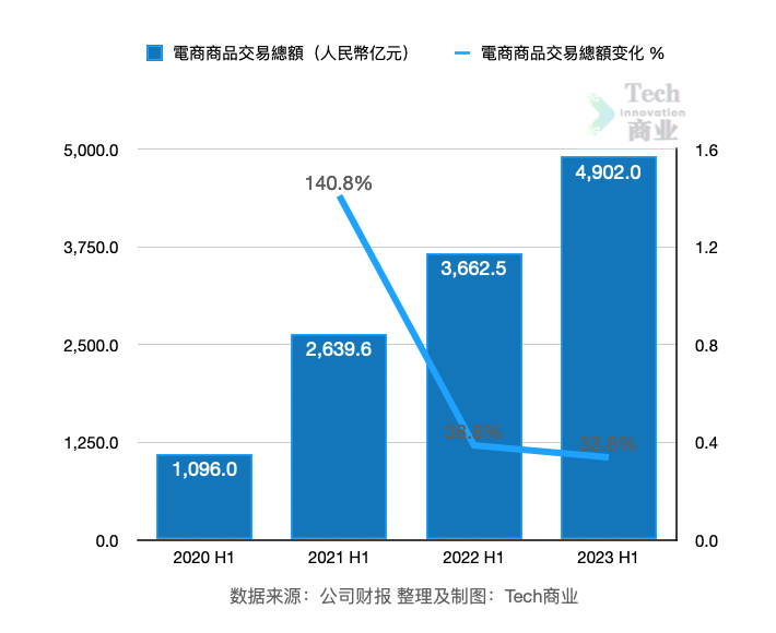 根据财报,快手公司2023年上半年电商商品交易总额为4902亿元,同比增幅为34%。该公司2021财年、2022财年同期该项交易额分别为2640亿元、3663亿元,对应交易额同比增速分别为141%、39%。即上半年该公司电商交易额为近年最高,但其增速降至较低水平。