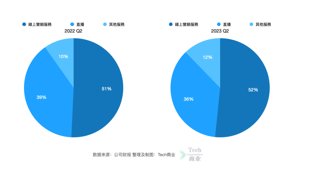 直播业务二季度收入占比为36%,低于上一财年同期占比的39%。