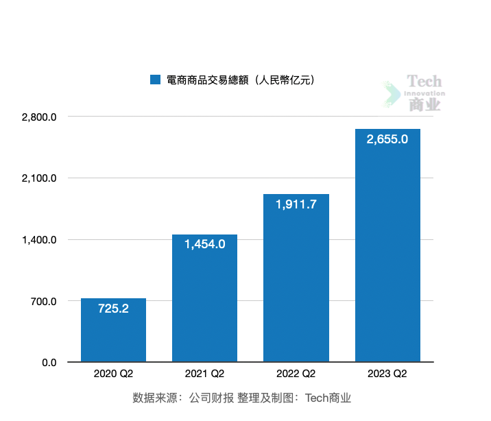 从最新季度电商商品交易总额来看,该公司二季度为2655亿元,高于上两个财年Q2同期交易额(1454亿元、1912亿元)。该公司2021年、2022年Q2同期该项交易额分别同比增长101%、32%。本季度同比增幅为39%,该增幅高于上一财年同期,但低于更早时期2021财年同期表现。