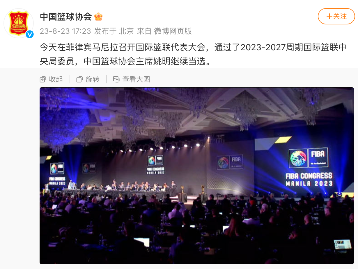 据@中国篮球协会 消息,8月23日,在菲律宾马尼拉召开国际篮联代表大会,通过了2023-2027周期国际篮联中央局委员,中国篮球协会主席姚明继续当选。