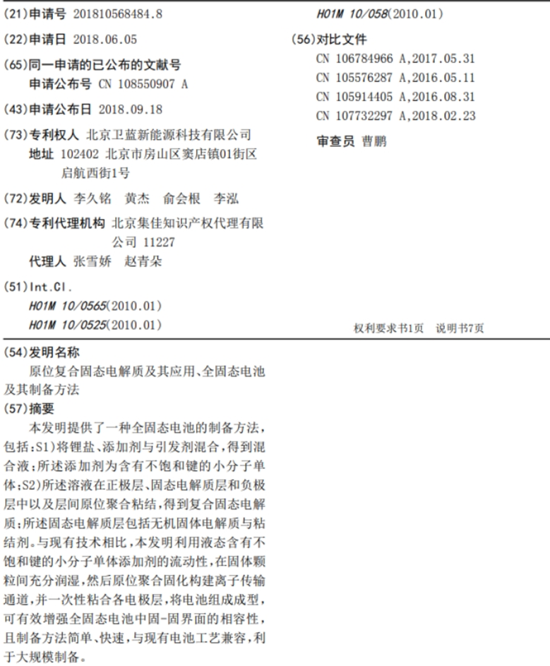 而给蔚来提供半固态电池的供应商卫蓝新能源,在锂电池领域的专利数量为420件。其中,“原位复合固态电解质及其应用、全固态电池及其制备方法”,作为卫蓝新能源的核心专利之一,专利号为CN 108550907 B。该专利可有效增强全固态电池的界面相容性,降低电池内阻,使其顺利商业化。