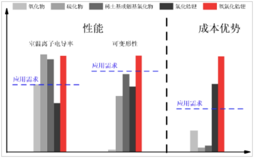 跳出这三种主流的技术路线来看,近期我国中科大学者研发出来了氧氯化锆锂,该材料在离子电导率、可变形性、成本方面,都要优秀于氧化物和硫化物。