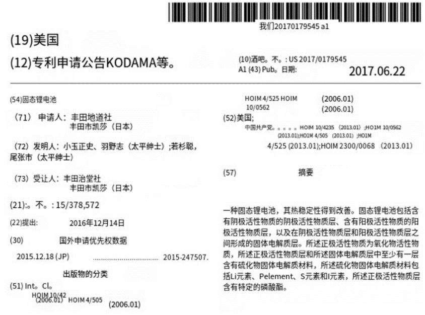 这三家日本固态电池企业的研发方向,都集中于硫化物。其中,丰田研发进展最快:早在2017年6月22日,丰田就在美国申请了以硫化物为电解质的固态电池专利。