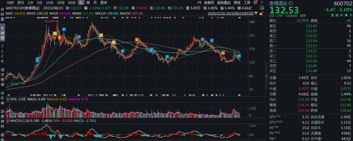 截止2023年8月23日收盘,舍得酒业报收于132.53元/股,较前期高点已下挫45.25%,市值为441.6亿元。