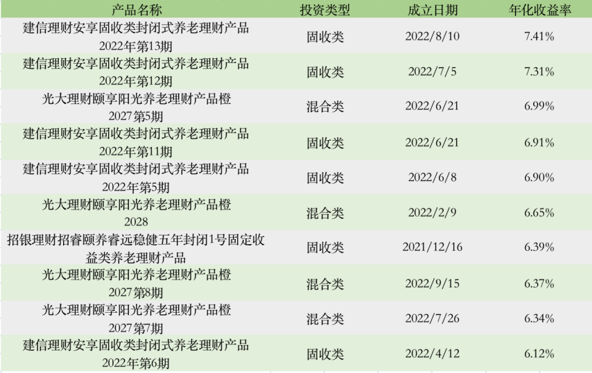 建信理财对于养老理财产品的布局也在今年取得了成效,界面新闻记者查询中国理财网的数据发现,2023年上半年养老理财年化收益前十名中,建信理财的产品占据了半壁江山,其旗下产品“建信理财安享固收类封闭式养老理财产品2022年第13期”以及“建信理财安享固收类封闭式养老理财产品2022年第12期”更是凭借7.41%和7.31%的年化收益率成为所有理财产品中唯二年化收益率超过7%的产品。