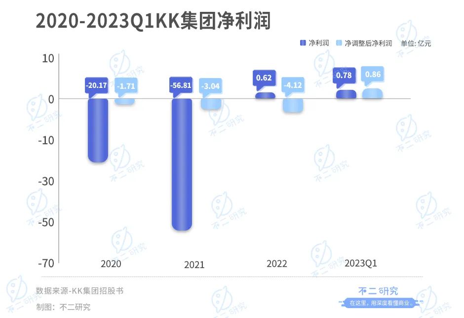 KK在招股书中解释称,巨额亏损大部分来自于按公平值计入损益的金融负债的公平值变动。若去除这部分影响,其经调整后净利润分别为-1.71亿元、-3.04亿元、-4.12亿元及0.86亿元,在今年一季度经调整净利扭亏为盈。