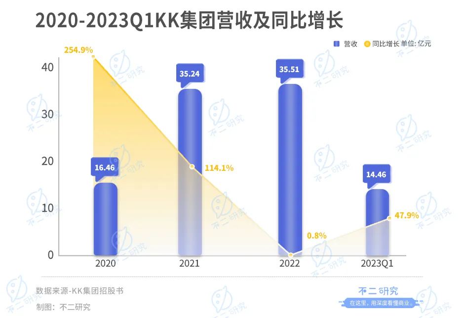 「不二研究」注意到,KK的营收增速已明显放缓,2020-2021年同比增长分别为254.9%、114.1%,而2022年增速几乎陷入停滞,同比增长仅为0.8%。