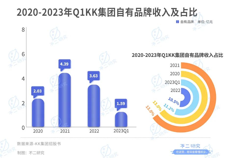 另外,自有品牌占比较少始终是KK经营中的一根刺。2020-2022年以及2023年一季度,KK自有品牌贡献营收占比分别为13.0%、13.0%、10.5%及11.2%。
