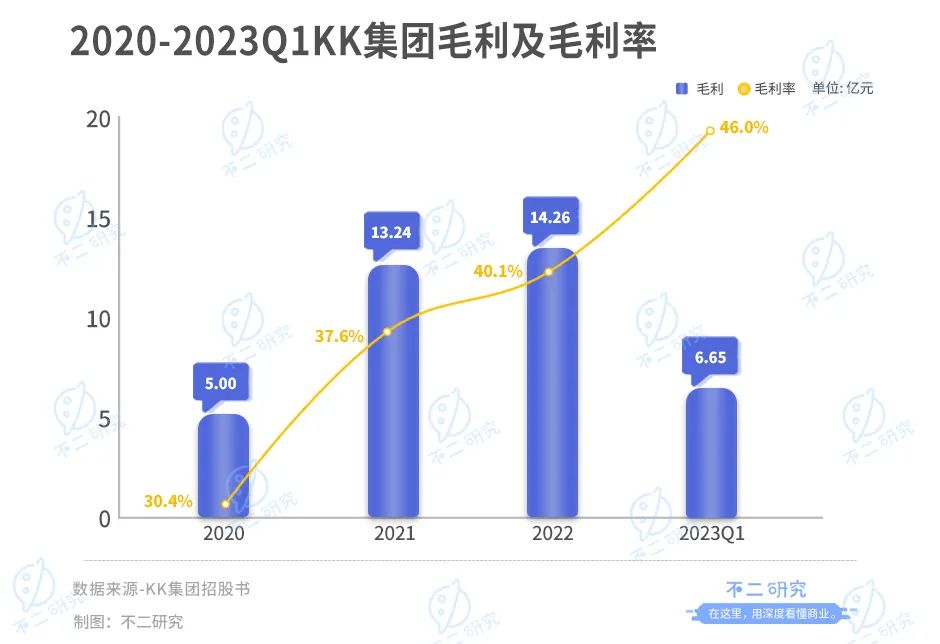 从毛利来看也是如此。2020-2022年及2023年一季度,KK的毛利分别为5.00亿元、13.24亿元、14.26亿元及6.65亿元,其中2020-2021年呈现翻倍式上涨,同比增长164.8%,但2022年增速断崖式下跌,仅有7.70%。