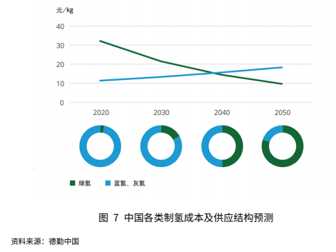 而且,据研报预测,绿氢受益于新能源发电的快速发展,制氢成本将不断降低。到2030年,国内电解水制氢规模将达到75GW左右,氢气平均制备成本20元/kg左右;到2050年,中国将以可再生能源发电制氢为主,氢气平均制备成本降至10元/kg。