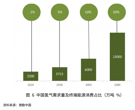 氢能在我国终端能源消费中的占比,也在逐年提升。目前,国内氢能需求以化工领域为主,其中合成氨行业对氢气的需求基本稳定在1000万吨左右,交通、冶金等行业氢气需求还有明显增长空间。预计到 2030 年、2050年,中国氢气的产量将分别达到3715万吨、6000万吨,在终端能源消费中的占比将分别达到5%、10%。