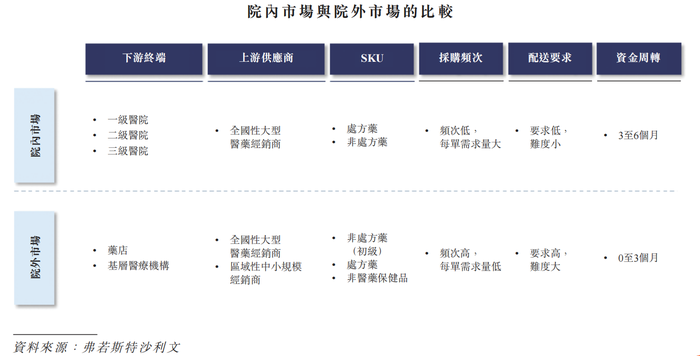 根据弗若斯特沙利文的资料,按 GMV计,中国院外数字化医药流通服务市场的市场规模由2018年的人民币535亿元增至2022年的人民币1,802亿元,年复合增长率为35.5%,2027年将达人民币3,583亿元,年复合增长率为14.7%,而其对整体院外医药流通市场的渗透率预计于2027年将达35.4%。