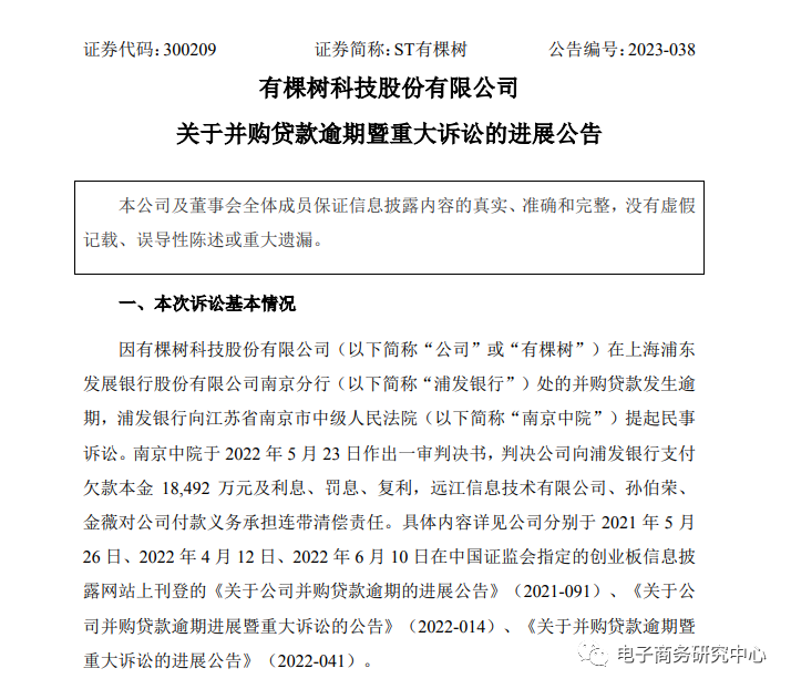 除业绩持续亏损外,有棵树近日发布公告称,有棵树在上海浦东发展银行股份有限公司南京分行处的并购贷款逾期未还。浦发银行向江苏省南京市中级人民法院提起民事诉讼,判决公司向浦发银行支付欠款本金1.85 亿元的利息、罚息、复利,此外远江信息技术有限公司、孙伯荣、金薇对公司的付款业务承担连带清偿责任。
