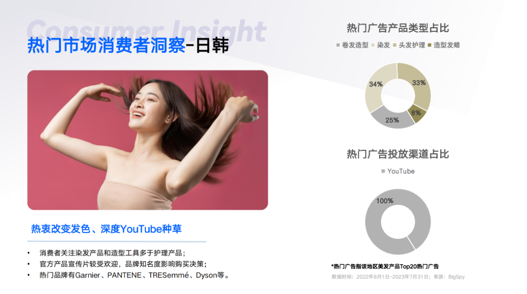 日韩地区的消费者对改变发色表现出了浓厚的兴趣,在相关市场中,Garnier、PANTENE等品牌占据了主要份额。在投放渠道上,Top20的热门广告在YouTube上表现出了强劲的影响力,凸显了该地区对于长视频种草的偏好。