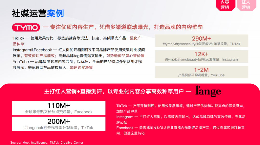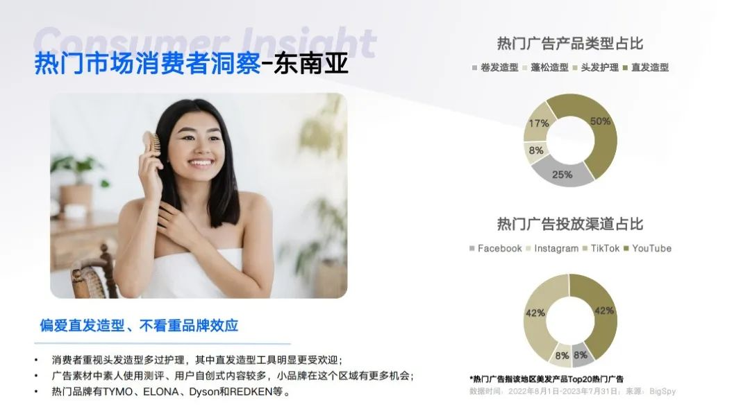 东南亚地区的消费者偏爱直发造型,在相关市场中,TYMO、ELONA等品牌占据了主要份额。在投放渠道上,TOP20的热门广告中TikTok和YouTube仍然是热门渠道,值得注意的是该地区在Facebook和Instagram的投放占比达16%,表明该地区对素人使用测评接受度高,小品牌有望出圈。