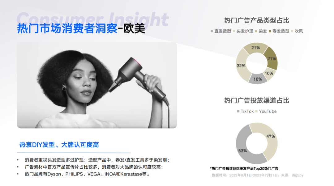 欧美地区的消费者热衷DIY发型,他们对品牌较为关注,Dyson、PHILIPS等品牌占据了主要的零售市场。在投放渠道上,Top20的热门广告在TikTok和YouTube上五五分成,可见长短视频对于产品渗透的能力较为突出。