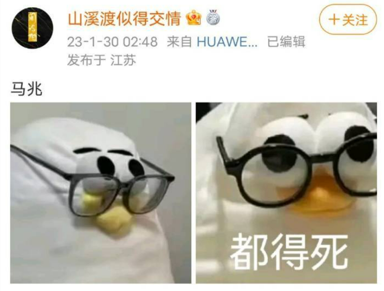 我们不妨先回顾一下马兆鸥的诞生与爆火。1月30日,微博网友@山溪渡似得交情 为家居品牌OCE旗下的睿智海鸥Oddy戴上眼镜,并配文”马兆“,评论区网友@沉堇 则给这两张图分别P上了头发衣服工牌和宇航服。