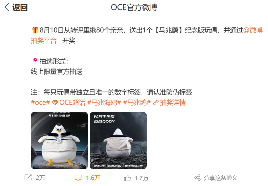 这天,OCE宣布马兆鸥生产数量有限,将以抽奖的形式直接赠送给粉丝。